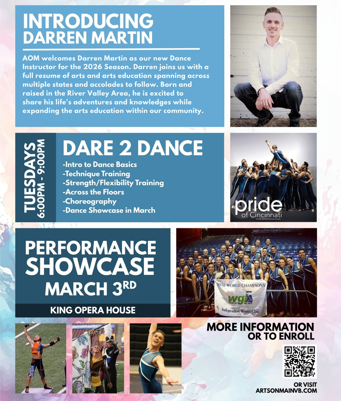 This Intro to Dance Basics class is perfect for dancers of all levels looking to build a strong foundation. Students will explore technique training, strength and flexibility development, across-the-floor exercises, and choreography, all while growing confidence and performance skills. The session will culminate in an exciting Dance Showcase on March 3rd, where students can shine and celebrate their progress on stage! AOM proudly welcomes Darren Martin as our new Dance Instructor for the 2026 season! Born and raised in the River Valley Area, Darren brings a wealth of experience in the arts and arts education from across the country and he’s eager to share his passion for movement and creativity with our community.